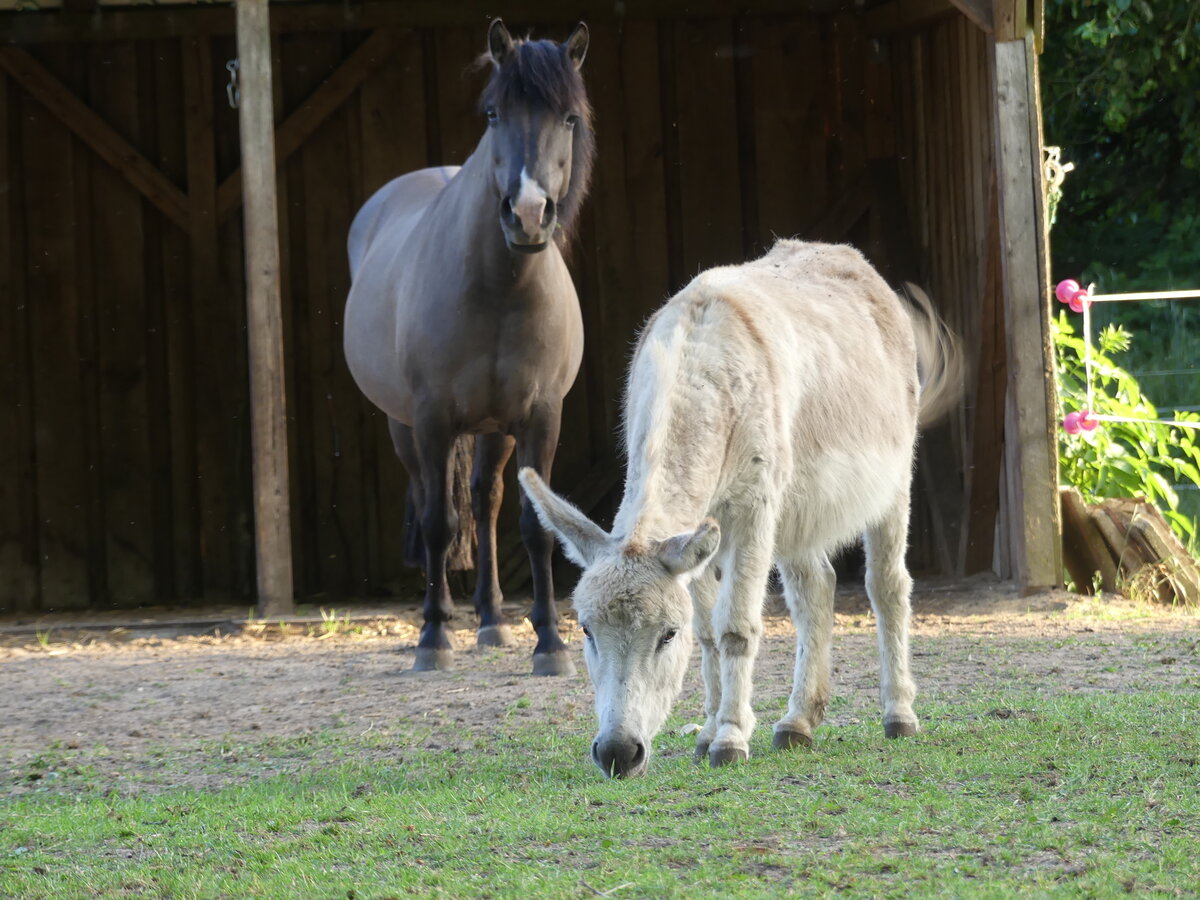 Wir haben einmal unsere Pony Gruppe bestehend aus Lewitzerstute Flitzi, der blinden Dülmener Stute Pia und Pony Wallach Yassir. Außerdem gehören noch unsere Eselwallache Fritz und Carlos dazu. Die beiden sorgen täglich für ordentlich Stimmung in der Herde... etweder toben sie über die Weide, stibitzen alles was nicht niet und nagelfest ist, spielen mit ihrem Ball, ärgern die Ponys oder sie "helfen" beim abäppeln und untersuchen alle Besucher gründlich nach Futter. Die beiden sind wirklich allerbeste Freunde und bringen uns jeden Tag zum lachen.